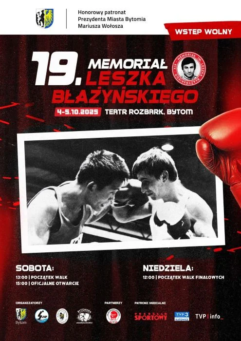 Międzynarodowy Bokserski Memoriał Leszka Błażyńskiego cieszy się dużą popularnością. Do 19. edycji, która odbędzie się w sobotę i niedzielę (4-5 października) w Teatrze Rozbark, zgłosiło się ponad 100 pięściarzy z 30 klubów. Początek turnieju w sobotę o godz. 13., oficjalne otwarcie o godz. 15. Niedzielne finały rozpoczną się o godz. 12. Wstęp bezpłatny. Zawody będą także transmitowane w serwisie YouTube Miasta Bytom.