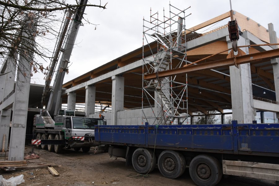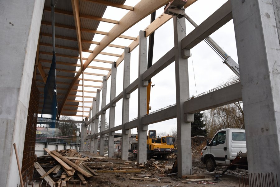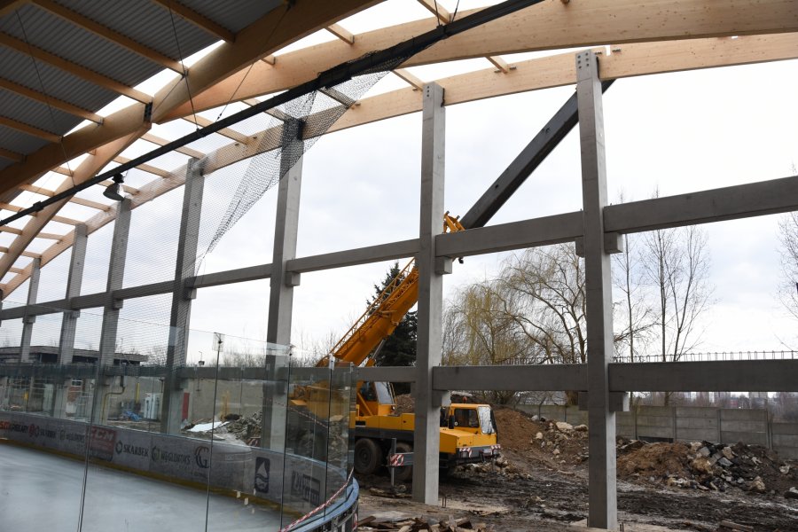 Prace związane ze stawianiem bocznej konstrukcji nowej hali lodowiska, budowy słupów żelbetowych, belek i płyt stropowych są już w zaawansowanej fazie.