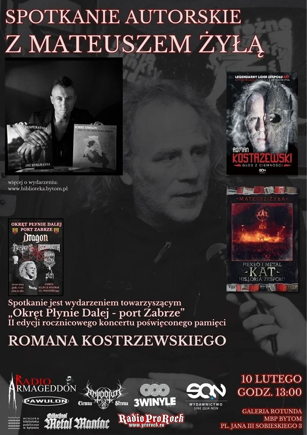 Mateusz Żyła, twórca książki „Piekło i metal. Historia zespołu Kat” oraz autor wywiadu rzeki z Romanem Kostrzewskim, będzie gościem Miejskiej Biblioteki Publicznej (Galeria Rotunda) w Bytomiu 10 lutego o godz. 13.00. Spotkanie autorskie jest wydarzeniem towarzyszącym koncertowi „Okręt Płynie Dalej – port Zabrze” drugiej edycji rocznicowego koncertu poświęconego.