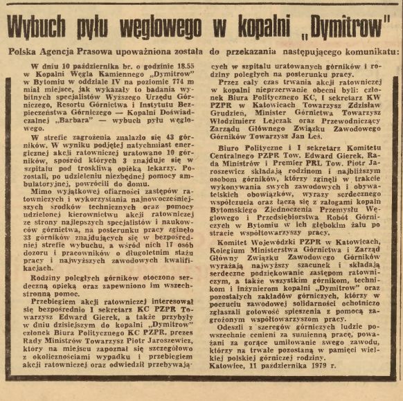 Dokładnie 43 lata temu, 10 października 1979 roku doszło w Kopalni Węgla Kamiennego “Dymitrow” do tragicznego w skutkach wybuchu pyłu węglowego – w wyniku wybuchu zginęło 33 górników.