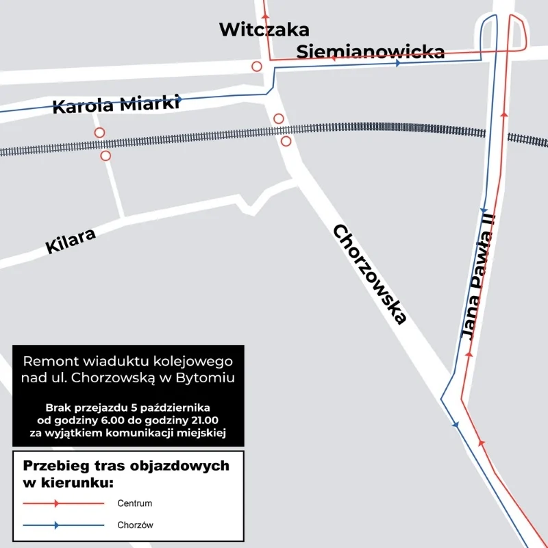 Na czas utrudnień związanych z zamknięciem drogi pod wiaduktem na ul. Chorzowskiej, wykonawca przygotował objazdy. Przejazd z centrum w stronę Chorzowa możliwy będzie ulicami: Siemianowicką i al. Jana Pawła II. Z kolei kierowcy jadący od strony Chorzowa do centrum, będą mogli skorzystać z dwóch możliwości: przejazdu al. Jana Pawła II i ulicą Siemianowicką oraz objazdem ulicami: Chorzowską – Tuwima – Kilara i dalej Łagiewnicką.