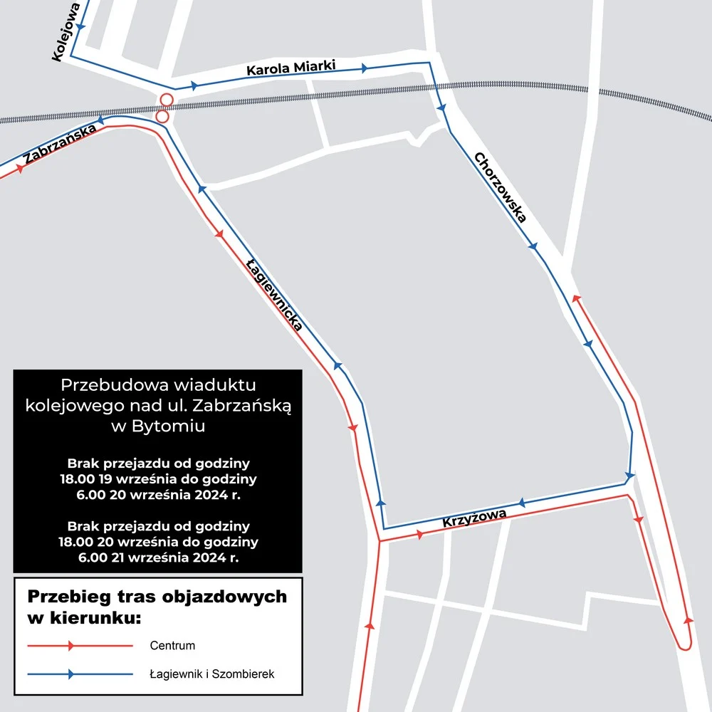 W związku z koniecznością wykonania pilnych prac związanych z przebudową wiaduktu kolejowego nad ul. Zabrzańską, w nocy z czwartku na piątek z 19 na 20 września w godz. 18:00–6:00 oraz z piątku na sobotę z 20 na 21 września w godz. 18:00–6:00 nie będzie możliwości przejazdu pod wiaduktem. Dopuszczony będzie wyłącznie ruch autobusów i tramwajów.