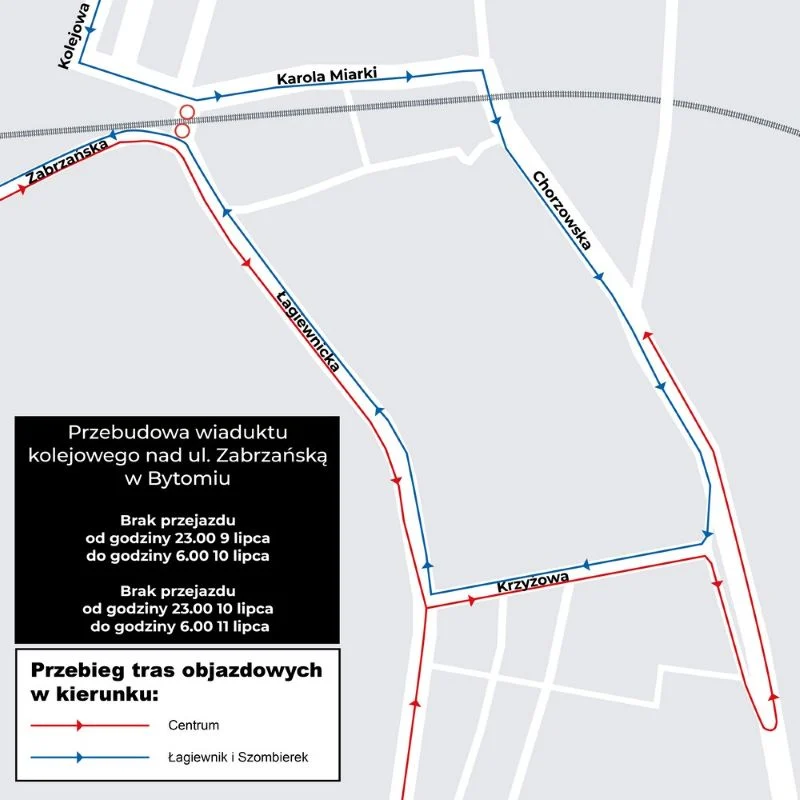 W związku z koniecznością wykonania pilnych prac związanych z przebudową wiaduktu kolejowego nad ul. Zabrzańską, w nocy ze środy na czwartek z 9 na 10 lipca w godz. 23:00 – 6:00 oraz w nocy z czwartku na piątek /z 10 na 11 lipca/ w godz. 23:00 – 6:00 nie będzie możliwości przejazdu pod wiaduktem. Dopuszczony będzie wyłącznie ruch tramwajów.