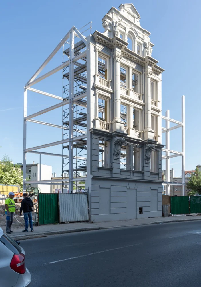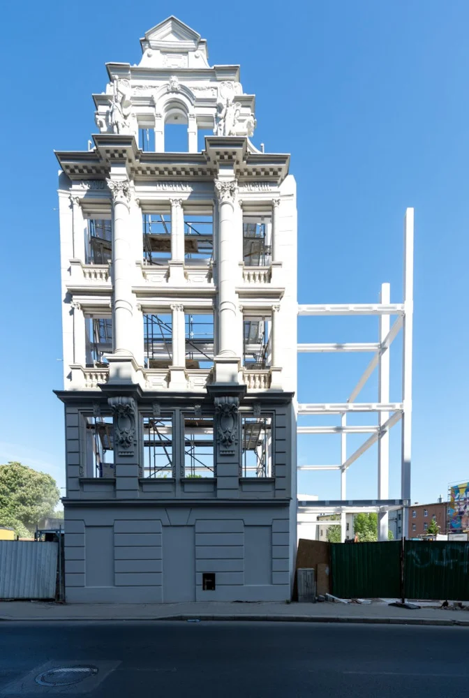 Do robiącej wrażenie odrestaurowanej zabytkowej elewacji frontowej przy ul. Kwietniewskiego powoli dołączają kolejne elementy. Trwa montaż stalowej konstrukcji, na której oprze się nowo powstająca szklana pierzeja ul. Kwietniewskiego.