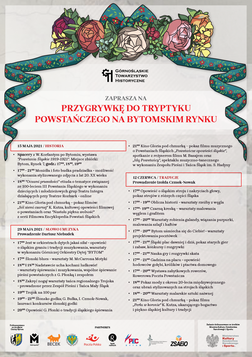 Górnośląskie Towarzystwo Historyczne, Miasto Bytom oraz Bytomskie Centrum Kultury zapraszają na wydarzenia kulturalno-historyczne obywające się w ramach obchodów 100 – lecia III Powstania Śląskiego pn. “Przygrywka do Tryptyku Powstańczego”.