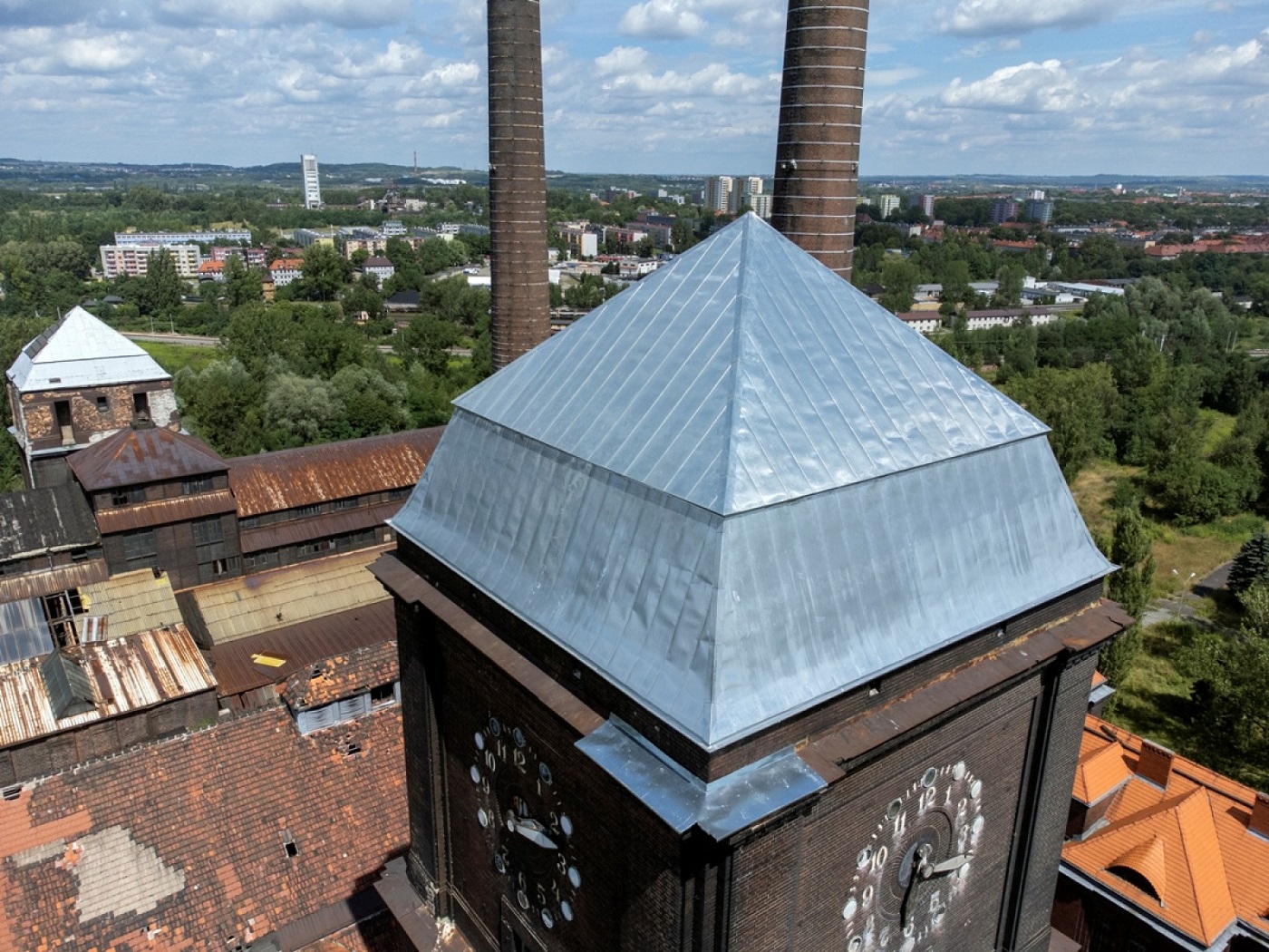 Wieża wodno-zegarowa Elektrociepłowni Szombierki ma nowy dach. Grupa ARCHE, która od 2022 roku jest właścicielem postindustrialnego zabytku, zakończyła prace remontowe zniszczonej konstrukcji i pokrycia dachu. Trwające od maja prace obejmowały wymianę konstrukcji więźby dachowej, elementów schodów i podłogi. Dach został pokryty blachą tytanowo-cynkową oraz zamontowane zostały brakujące rynny.