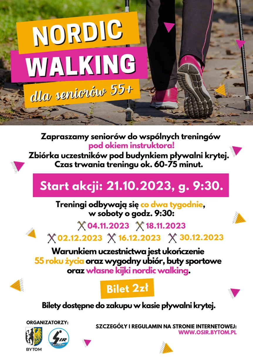 Miasto Bytom oraz OSiR Bytom zaprasza wszystkie osoby, która ukończyły 55 rok życia do wzięcia udziału w zajęciach nordic walking pod okiem instruktora. Wspólne treningi w ramach akcji NORDIC WALKING DLA SENIORÓW 55+ będą odbywać się cyklicznie – co dwa tygodnie, w soboty.