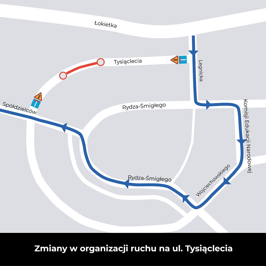 - dla kierowców, którzy chcieliby dojechać od strony skrzyżowania ulic Tysiąclecia i Legnickiej do ul. Spółdzielców zostanie wprowadzony objazd ulicami: Legnicką – Rydza-Śmigłego – Komisji Edukacji Narodowej – Wojciechowskiego – Rydza-Śmigłego – Spółdzielców