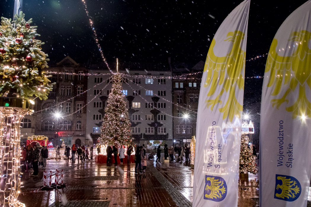 W najbliższych tygodniach czeka tu mnóstwo przedświątecznych atrakcji. W uroczystym uruchomieniu świątecznych iluminacji na bytomskim rynku uczestniczył marszałek Jakub Chełstowski oraz prezydent Bytomia, Mariusz Wołosz.