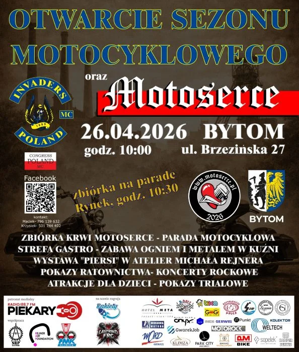 Wielka parada motocyklowa, zabawa ogniem i metalem w kuźni, a także m.in. pokazy ratownictwa, koncerty, atrakcje dla dzieci. Po raz XIX członkowie klubu Invaders MC Poland organizują w Bytomiu akcję „Motoserce”. Głównym celem wydarzenia, które odbędzie się w niedzielę, 26 kwietnia jest zbiórka krwi. Impreza odbędzie się przy ul. Brzezińskiej 27.