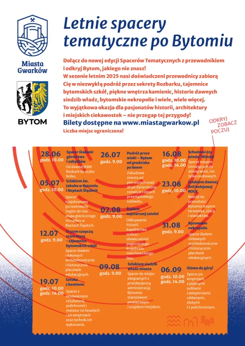Wśród przewodników, którzy zaproszą w tym roku turystów do zwiedzenia ciekawych miejsc w Bytomiu, będą Teresa Ebis, Tomasz Sanecki, Dariusz Pietrucha, Marek Wojcik oraz przewodnicy bytomskiego oddziału PTTK. Przygotowali oni wiele interesujących tematów. Będzie okazja, by przejechać się zabytkowymi windami w stylowych bytomskich kamienicach, poznać tajemnice najstarszej siedziby władców Bytomia na Wzgórzu Małgorzatki, posłuchać, o czym szepczą najpiękniejsze mury szkolne w Bytomiu, dowiedzieć się, jak urządzili się dawni włodarze i jakie mieli kompetencje, odkryć mało znane pozostałości starej sztolni.