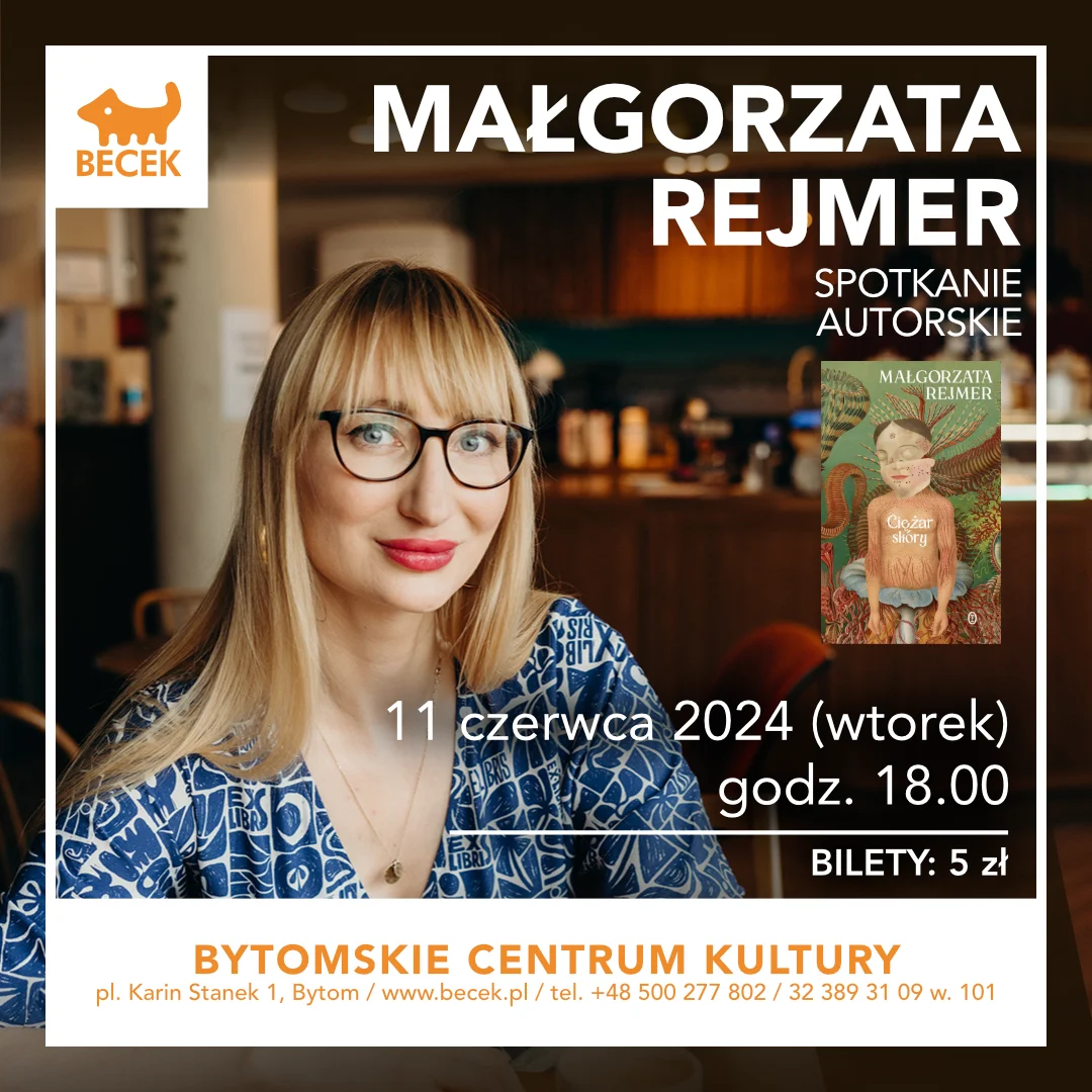 Rozmowa odbędzie się z okazji wydania jej najnowszej książki „Ciężar skóry”, a poprowadzi ją Adrian Chorębała. Rejmer zakłada na grzbiet wiele skór, czuje ich ciężar i opisuje go tak, że sami zaczynamy się pod nim zapadać. Zaskakujący, intrygujący i mocny to zbiór opowiadań.