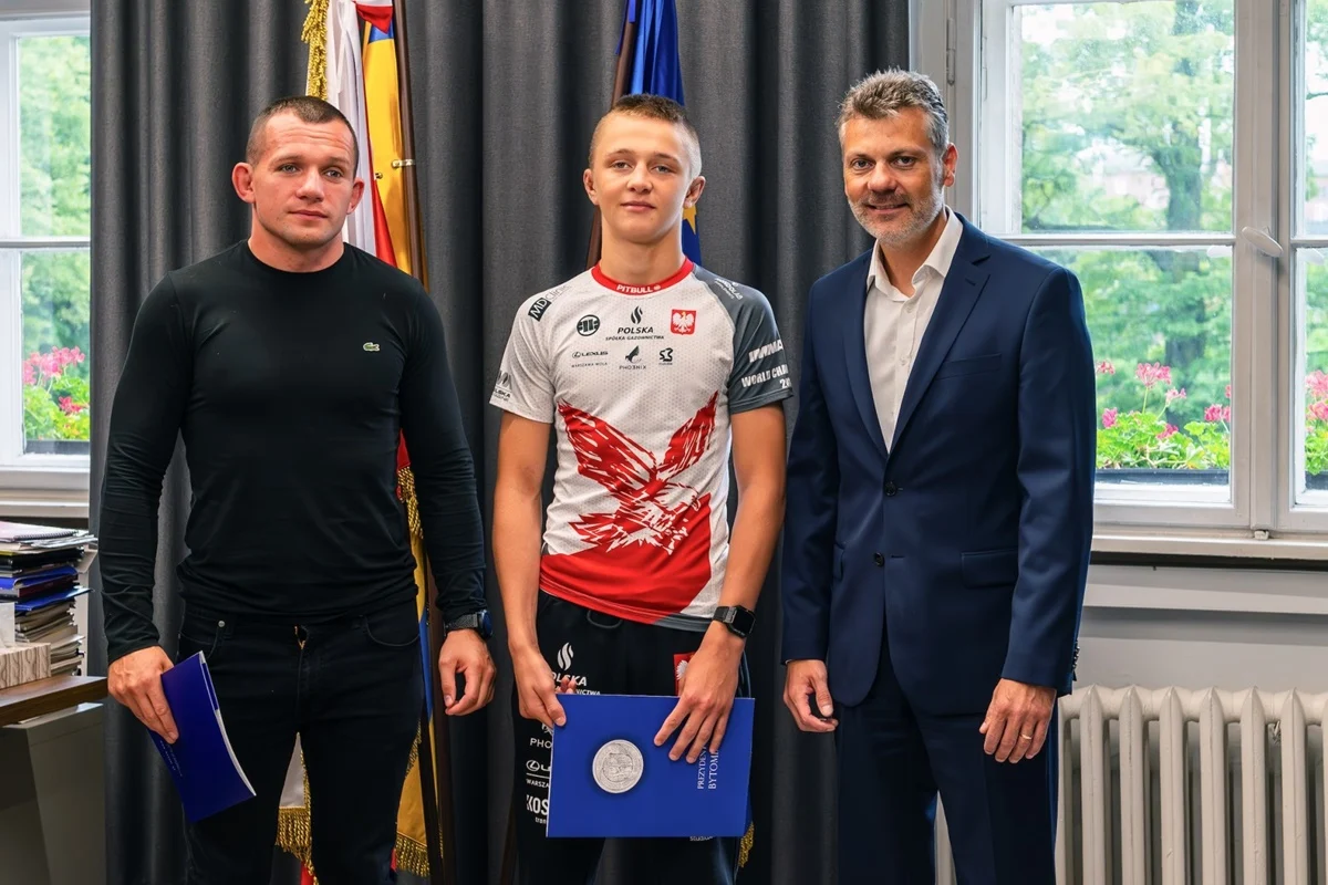 Dominik Sitko zrobił furorę w Młodzieżowych Mistrzostwach Świata w MMA w Abu Dhabi. 16-letni zawodnik Shark Top Team Bytom i uczeń Zespołu Szkół Administracyjno-Ekonomicznych i Ogólnokształcących wywalczył srebrny medal. W poniedziałek, 19 sierpnia prezydent Mariusz Wołosz złożył gratulacje utalentowanemu fighterowi oraz trenerowi Rafałowi Raczyńskiemu.