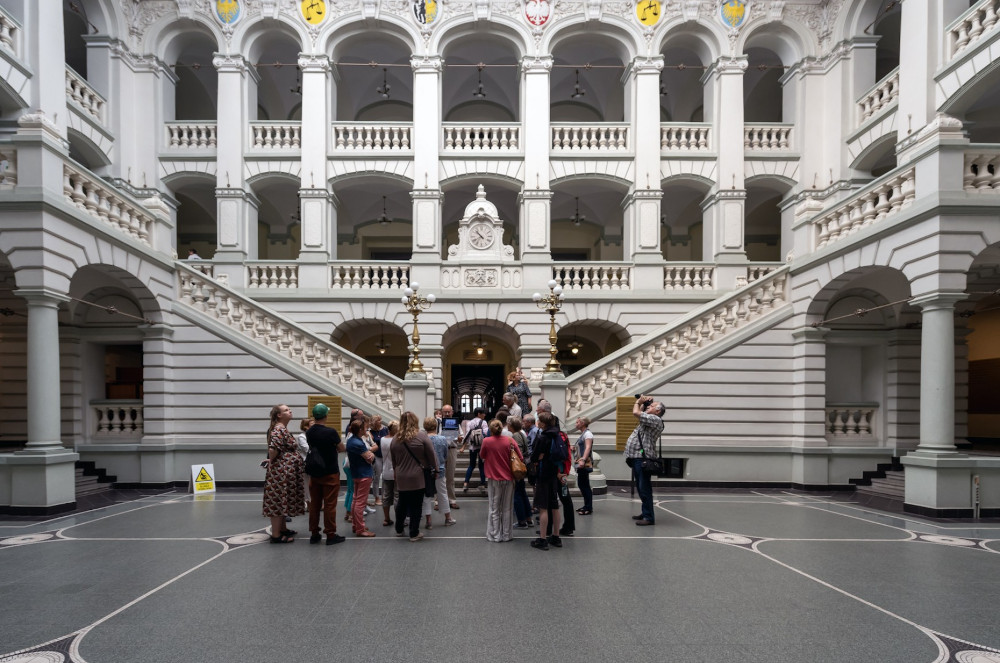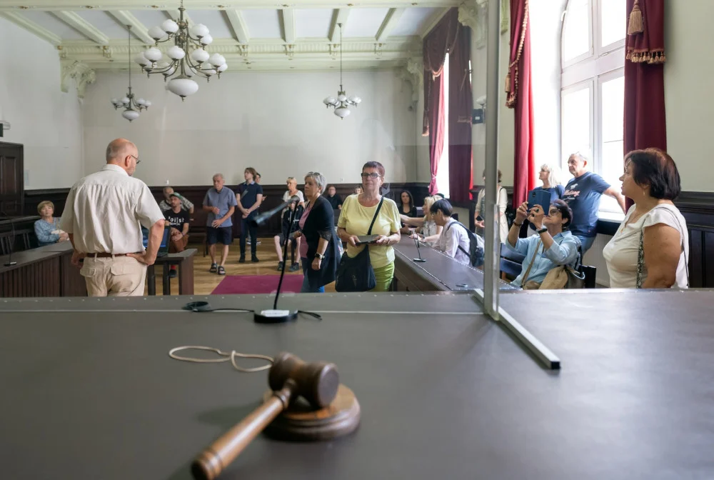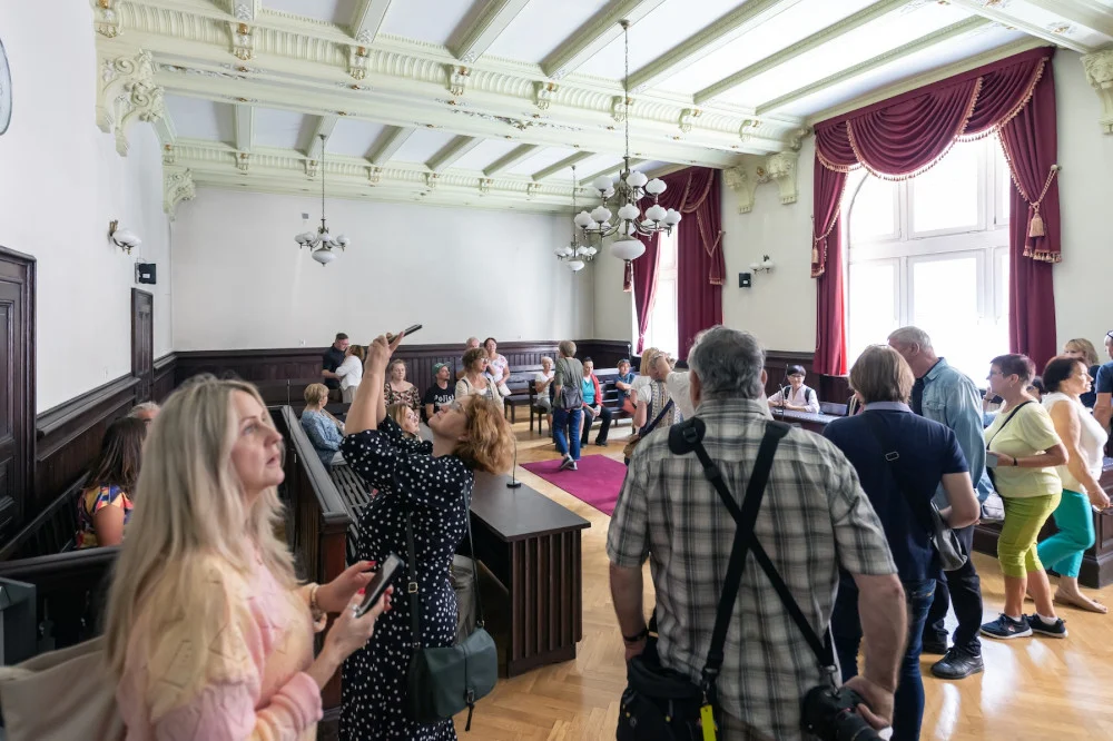 W działającym przy ulicy Piekarskiej Sądzie Rejonowym grupa słuchała historii budynku i odwiedziła zabytkową salę rozpraw. Podziwiali otaczające ich krużganki, kolumnadę zdobią herbami Bytomia, Śląska i Polski. Nie brakuje tam też symbolu sprawiedliwości – wagi. Budynek powstał w drugiej połowie XIX wieku zgodnie ze wzorem bytomskiego projektanta Paula Jackischa.