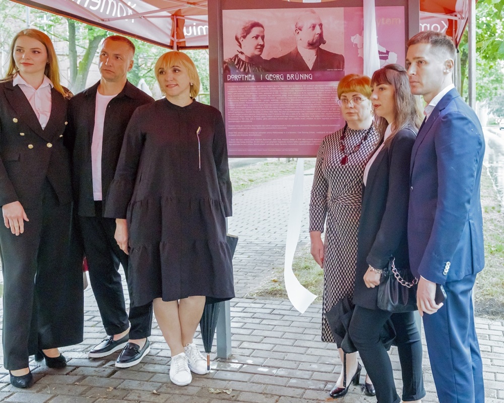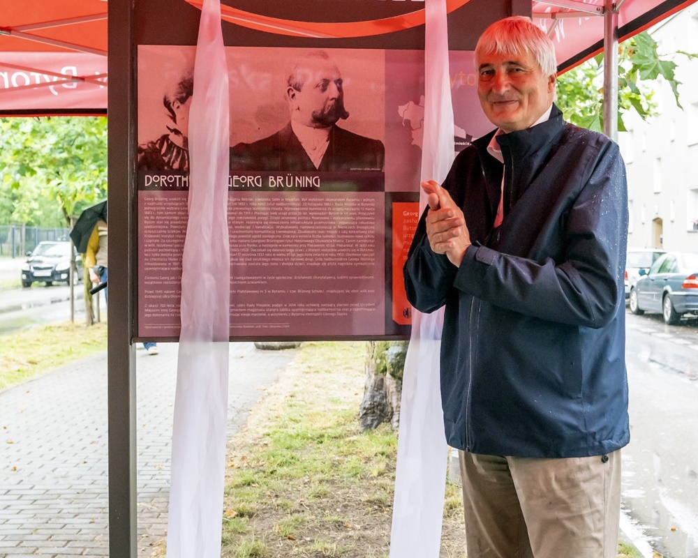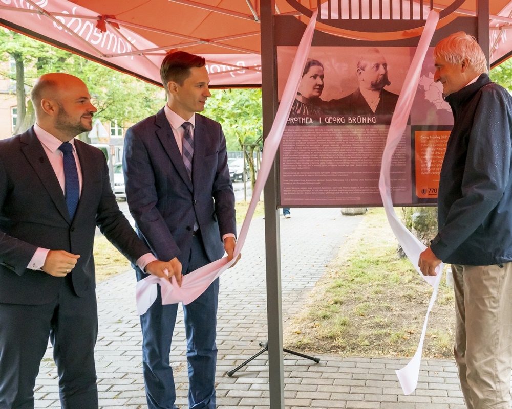 Odsłonięta wczoraj przy al. Legionów 4 tablica upamiętnia Georga Bruninga oraz jego życie rodzinne. Dlatego po jednej stronie tablicy zobaczymy wizerunek Georga i jego żonę Dorotheę, a z drugiej willę, którą w 1901 roku mieszkańcy wybudowali dla niego jako dowód wdzięczności.