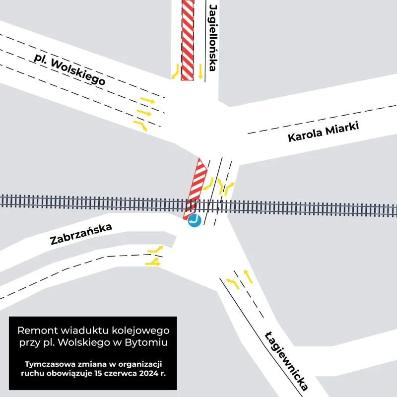 15 czerwca wprowadzona zostanie także zmiana organizacji ruchu na ul. Jagiellońskiej. Zamknięty zostanie jeden z pasów ruchu, a auta będą mogły poruszać się tylko skrajnym prawym pasem w kierunku Placu Wolskiego oraz jednym pasem na wprost (po torowisku) w kierunku Szombierek.