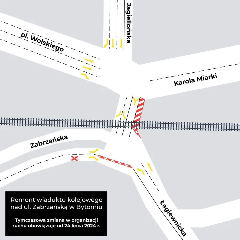 W środę 24 lipca wykonawca przebudowy linii kolejowej nr 131 rozpocznie prace związane z przebudową drugiej podpory wiaduktu na Zamłyniu. W związku z tym, zmieni się organizacja ruchu. Wyłączony z ruchu zostanie chodnik oraz zewnętrzny pas jezdni umożliwiający dojazd z ul. Zabrzańskiej i Łagiewnickiej w stronę ul. Miarki. Kierowcy ponownie będą mogli korzystać z obu pasów ruchu pod wiaduktem z centrum do Łagiewnik i Szombierek.