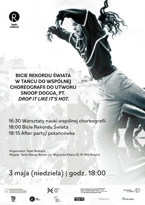 W niedzielę 3 maja o godzinie 18:00 Teatr Rozbark zaprasza wszystkich chętnych do wspólnego ustanowienia rekordu w tańcu do utworu Snoop Dogga: „Drop it like it’s hot”. Wydarzenie odbędzie się przed Centrum Sportów Wspinaczkowych i Siłowych Skarpa Bytom przy ul. Kilara 33 w Bytomiu-Rozbarku. W razie niepogody zapraszamy do przestrzeni Teatru Rozbark.