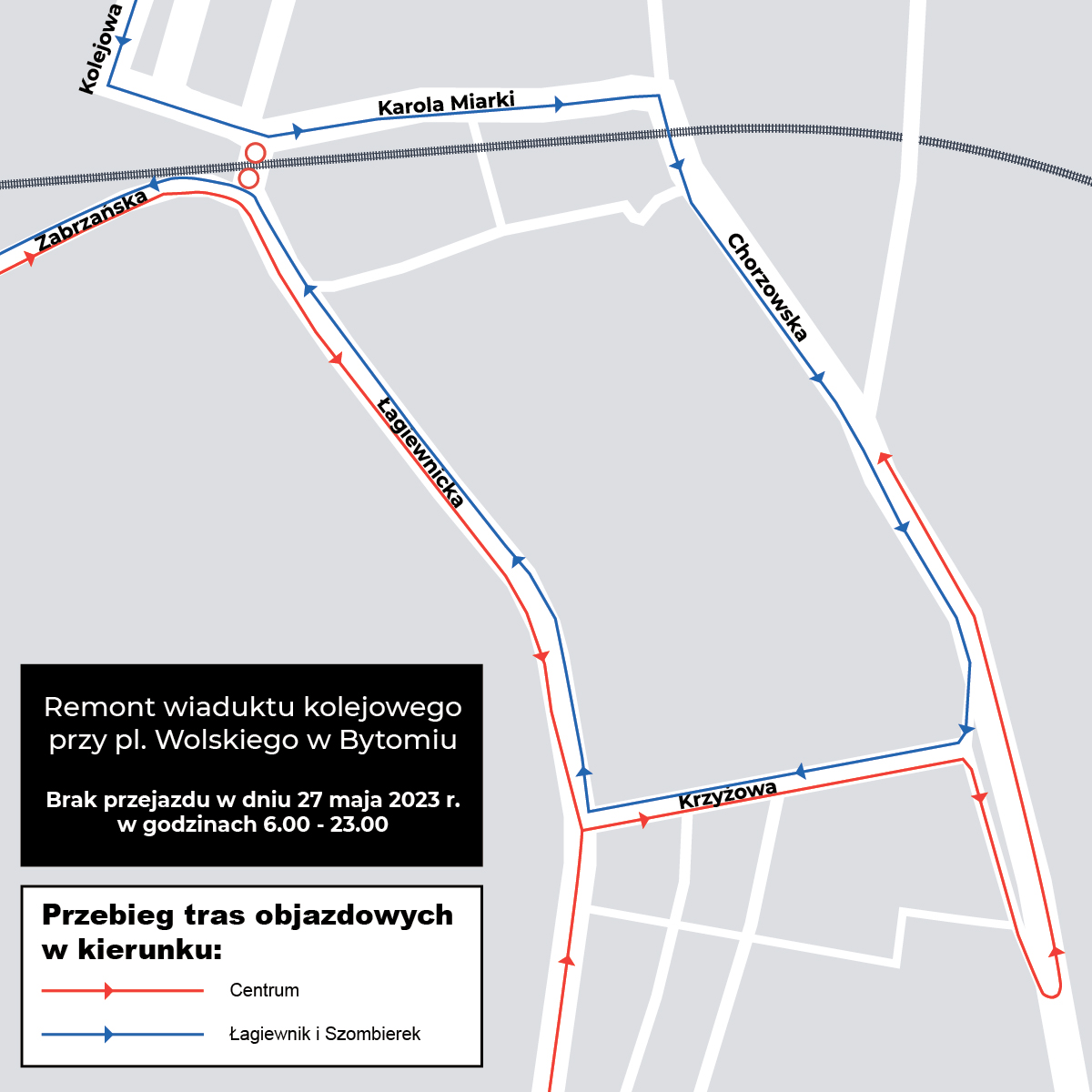 • do Szombierek i Łagiewnik od strony skrzyżowania ul. Jagiellońskiej z pl. Wolskiego przygotowano objazd ulicami: Jagiellońską – pl. Wolskiego – Powstańców Warszawskich – Moniuszki – Miarki – Chorzowską – Starochorzowską – Krzyżową – Łagiewnicką;