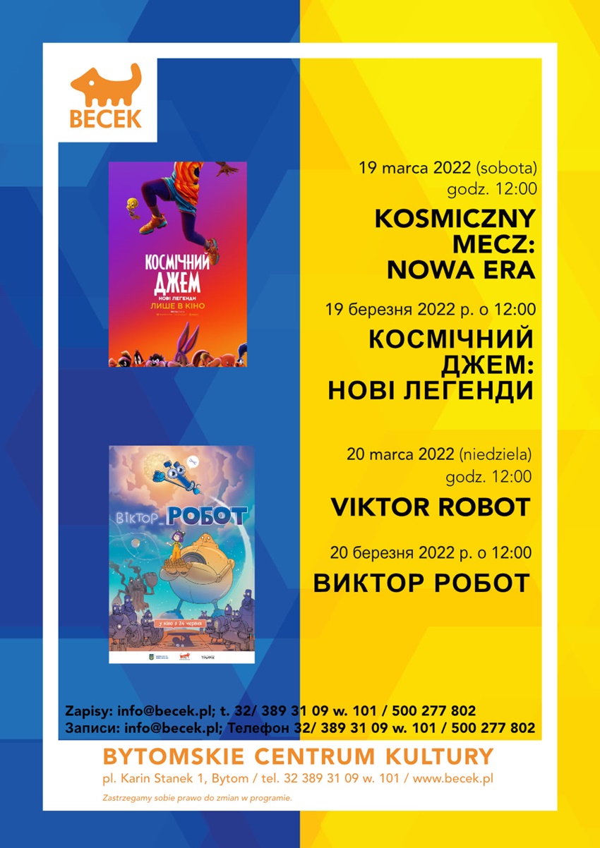 Центр Культури в Битомі відкриває свої кінозали для родин з України. Щиро запрошуємо на спеціально підготовані сеанси, під час яких покажемо два фільми. Сподіваємося, що в цей складний час ці фільми покажуть силу співпраці і взаємодопомоги. Хочемо, аби хоча б упродовж цього короткого часу перегляду фільмів українські родини могли розпружитися і відпочити.