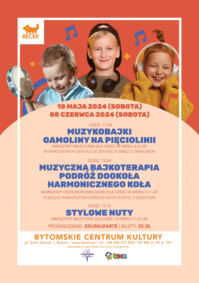 W Bytomskim Centrum Kultury 18 maja (sobota), w godzinach od 12:00 do 12:45, odbędą się warsztaty muzyczne dla dzieci w wieku 5-7 lat. Warsztaty ogólnorozwojowe, odpowiednio dostosowane do grupy wiekowej, oparte na autorskiej książce p.t. „Podróż dookoła Harmonicznego koła”, muzyce i scenariuszach.