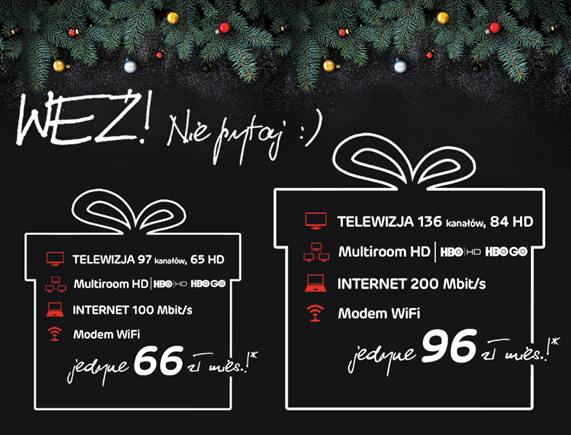 Dwa pudełka, kilkadziesiąt kanałów, trochę taśmy, Multiroom HD, pakiet Premium HBO HD i HBO GO, szczypta Internetu, modem WiFi, czerwona wstążka i voilà! Dwie świąteczne paczki gotowe! Tak w połączeniu sił dwóch rudzkich firm – Elsatu i Silemana powstała nowa oferta dla osób, które chcą dołączyć do grona Abonentów.