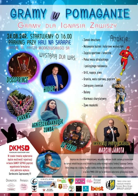 W koncercie charytatywnym na rzecz chorego na wrodzone zaburzenia glikozylacji białek chłopca wystąpią: Hicior, Discoprince, Charms, Dj Pablo i Agnieszka Hanusek Zumba, a całość koncertu poprowadzi Marcin Janota. Oprócz występów na scenie głównej organizatorzy zapewnią także wiele atrakcji dla dzieci, m.in.: malowanie twarzy, dmuchańce, warsztaty sportowe i taneczne, kiermasz, pokaz wozu strażackiego. Będzie także strefa gastronomiczna.