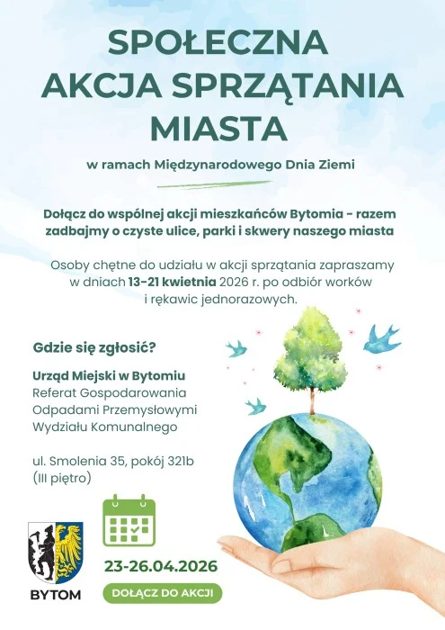 Z okazji Międzynarodowego Dnia Ziemi już po raz kolejny w Bytomiu zorganizowana zostanie społeczna akcja sprzątania miasta. Wielkie porządki zaplanowane są od 23 do 26 kwietnia. Można już zgłaszać swój udział, wypełniając specjalny formularz.