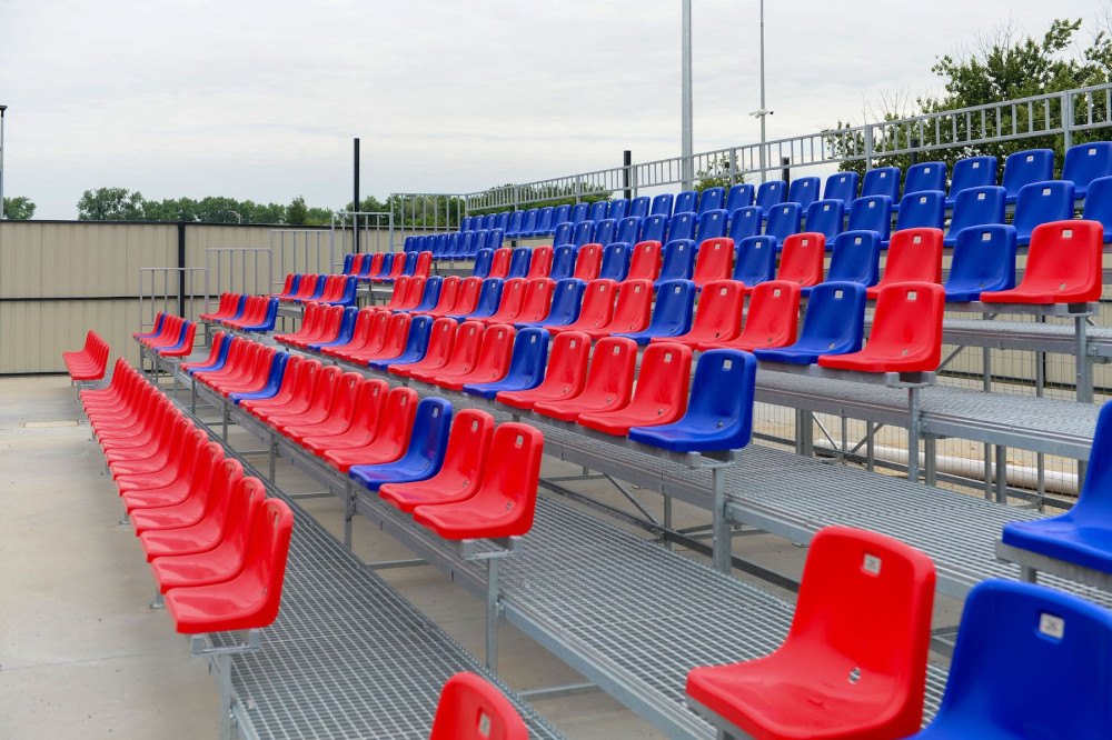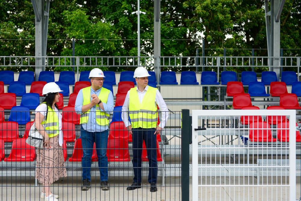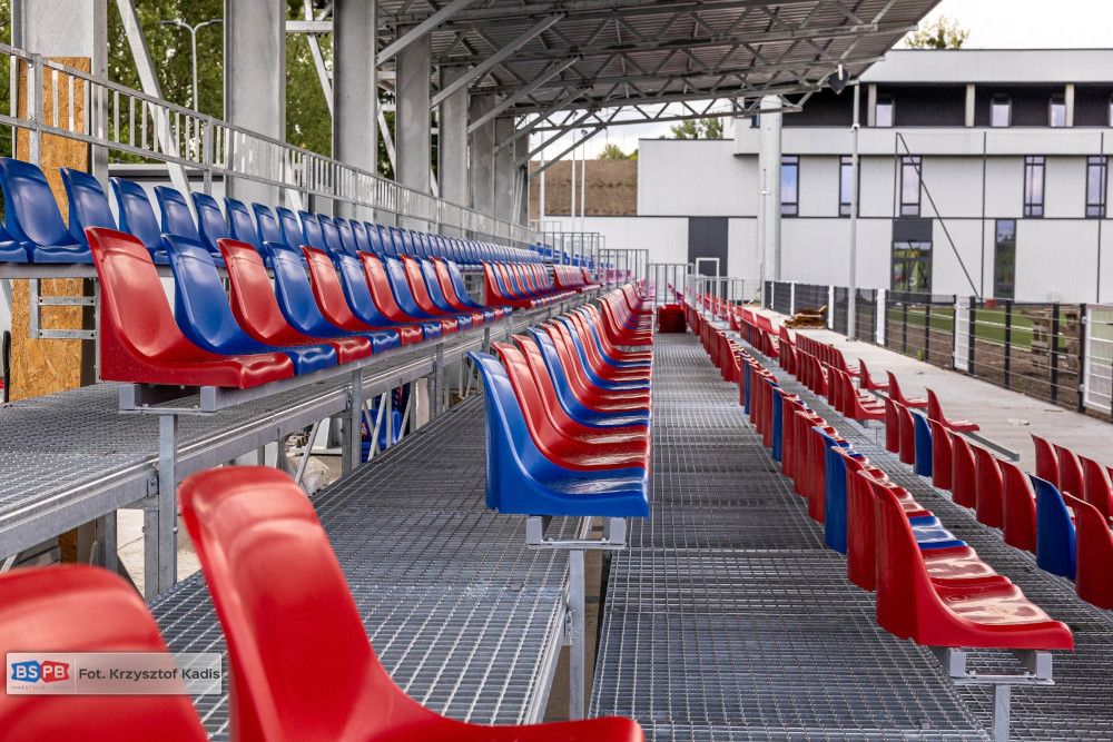 Wykonawca finalizuje prace pierwszego etapu budowy. Firma, realizująca inwestycję, zakończyła montaż niebiesko-czerwonych siedzisk na trybunach, zamontowała kołowroty przy wejściach na obiekt oraz zabudowała już w znacznej części trybuny wraz z kompletnym zadaszeniem części centralnej.