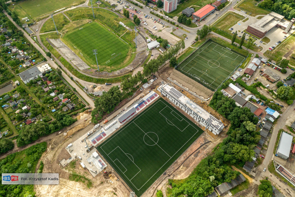 Przy ul. Piłkarskiej trwają prace przy budowie nowego boiska wraz z zapleczem treningowym. Wykonawca inwestycji – firma Tamex Obiekty Sportowe SA zakończył montaż siedzisk na trybunach oraz prowadzi prace w budynku klubowym i na zewnątrz obiektu przy wzmacnianiu skarpy.