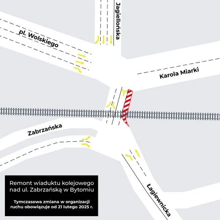Zmiany dotkną także pieszych. Zamknięty zostanie chodnik pod wiaduktem, dlatego osoby przemieszczające się między ul. Miarki a Łagiewnicką i Zabrzańską będą musiały korzystać z tunelu zachodniego pod dworcem PKP.