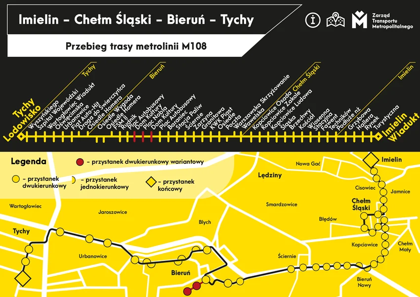 Z kolei na trasie Tychy – Bieruń – Chełm Śląski – Imielin M108 zastąpi linię autobusową 54. Pasażerowie będą mogli skorzystać ze zwiększonej liczby kursów, które realizowane będą w równym takcie. W dni robocze nowa „eMka” na przystankach pojawiać się będzie co 30 minut, a w soboty – co godzinę.