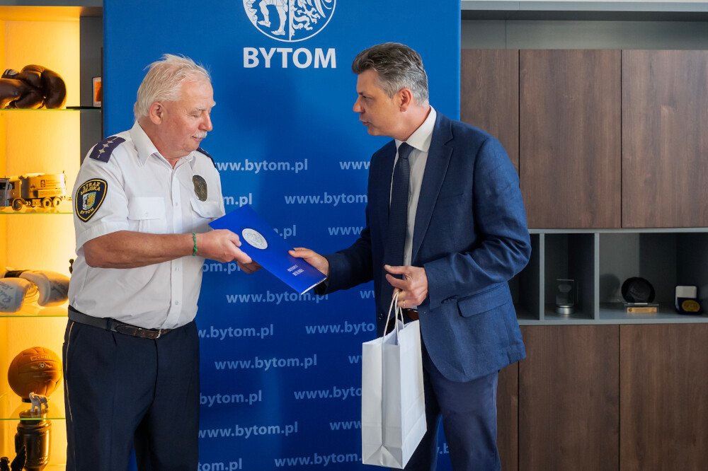 Starszy inspektor Marek Wąsowicz - najdłużej pracujący strażnik miejski w Bytomiu po 43 latach służby przechodzi na zasłużoną emeryturę. Z funkcjonariuszem spotkał się w czwartek, 27 lipca, prezydent Mariusz Wołosz.
