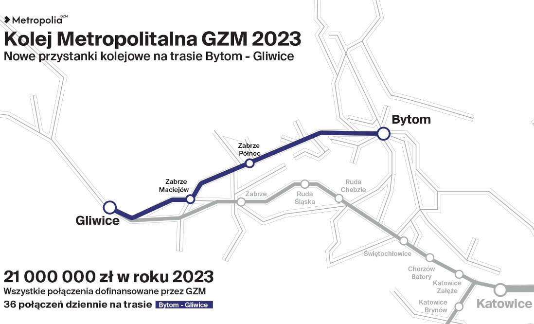 W 2023 roku Górnośląsko-Zagłębiowska Metropolia sfinansuje łącznie 94 połączenia kolejowe za kwotę 21 mln zł. Wśród finansowanych połączeń, 36 dotyczą relacji Bytom-Gliwice, 22 Katowice-Gliwice, 24 Tychy Lodowisko-Katowice, a 12 Tychy Lodowisko-Dąbrowa Górnicza Ząbkowice.