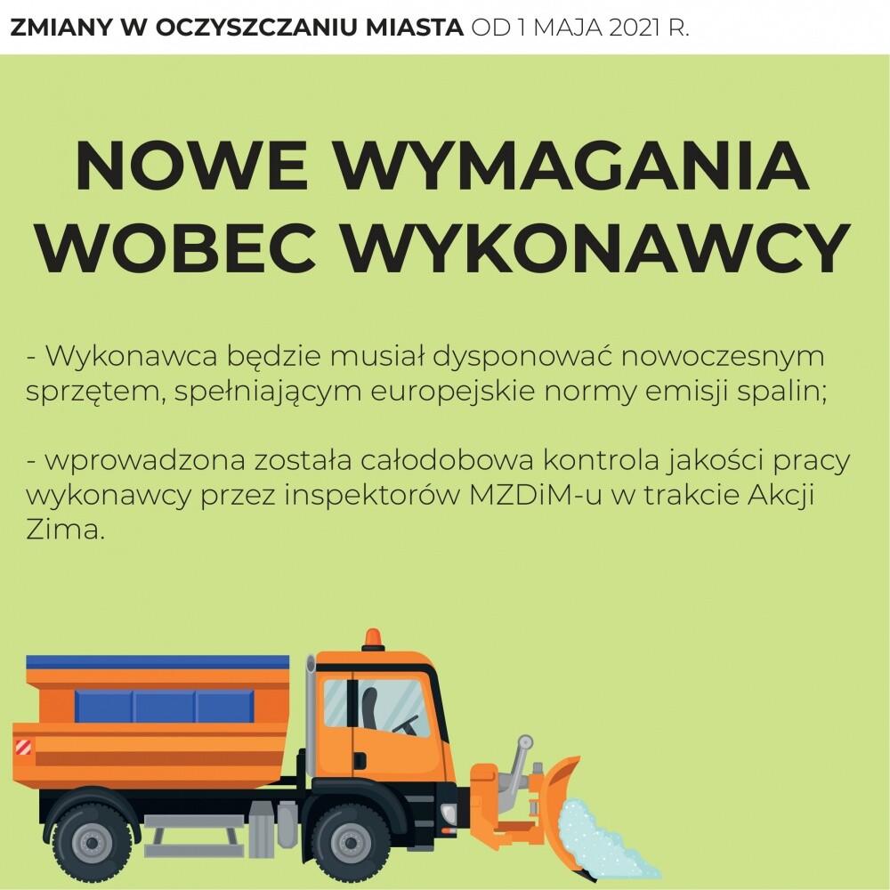 W ogłoszonym w grudniu postępowaniu przetargowym na oczyszczanie miasta, wykonawca będzie musiał dysponować sprzętem spełniającym europejskie normy emisji spalin, wprowadzona została całodobowa kontrola jakości pracy wykonawcy przez inspektorów MZDiM-u w trakcie Akcji Zima, jak również miejska jednostka zrezygnowała z gotowości wykonawcy do Akcji Zima, co z pewnością wpłynie na obniżenie kosztów ponoszonych w okresie jesienno-zimowym.