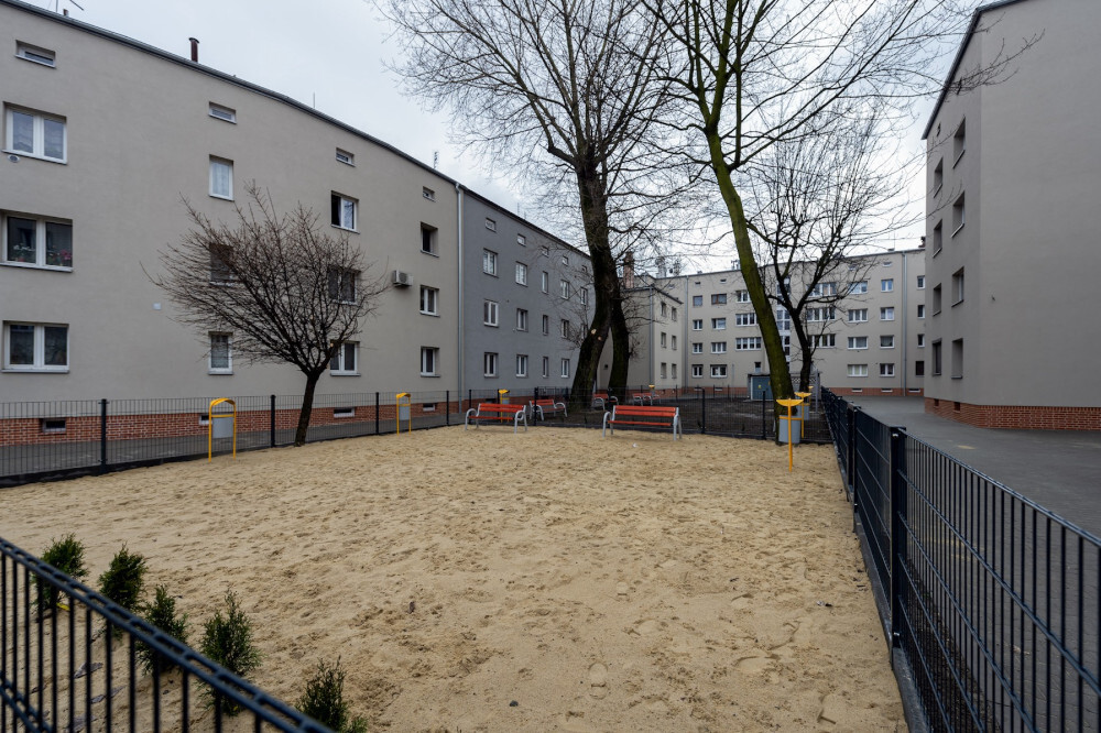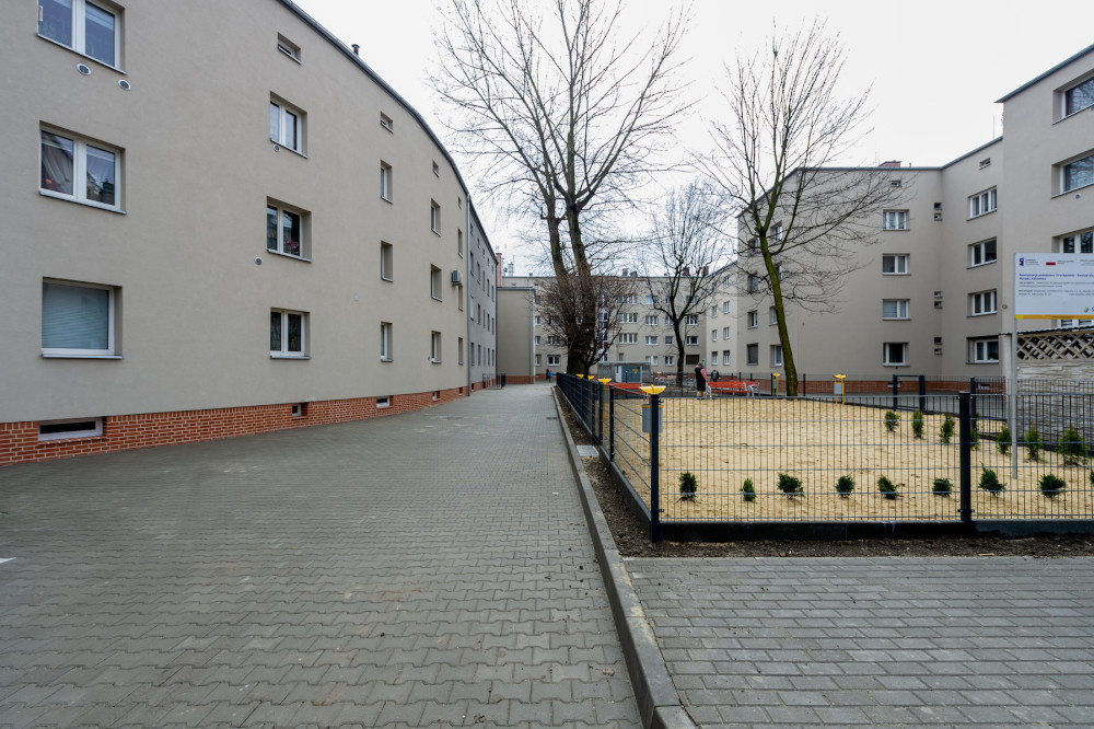 Rewitalizacji budynków towarzyszyły też prace polegające na zagospodarowaniu 2,5 tys. mkw. tamtejszych podwórek. Powstały nowe chodniki, ogrodzenie, wygrodzony wybieg dla psów. W podwórkach pojawiły się ławki, kosze na śmieci, nowe nasadzenia i udogodnienia dla osób z niepełnosprawnością takie jak np. podjazdy, tabliczki z napisami brajlowskimi.