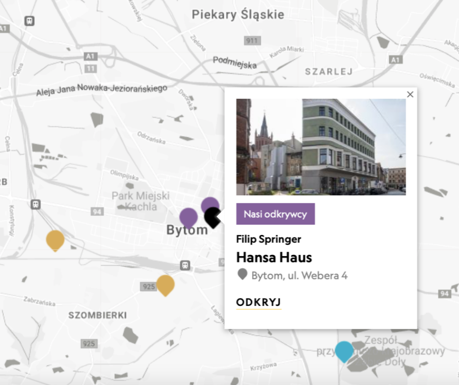 Kolejne pinezki to już obiekty nierozerwalnie związane w postindustrialną historią Bytomia: osiedle robotnicze w Bobrku, którego architektura zachwyciła Filipa Springera czy porównany do bazy rebeliantów z „Gwiezdnych Wojen” Bolko Loft przy Kruszcowej - jeden z pierwszych w naszym kraju obiektów poprzemysłowych zaadaptowanych na mieszkanie.
