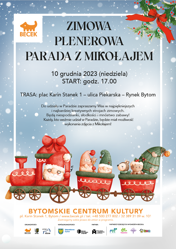 Santa Truck, czyli specjalny samochód ze świąteczną platformą wyruszy sprzed siedziby Beceku i przejedzie ulicami Prusa, Piekarską, Sądową, pl. Kościuszki, a następnie Gliwicką do Rynku. W zimowej paradzie wezmą udział m.in. bytomskie mażoretki, górnicza orkiestra dęta oraz cyrkowi akrobaci.