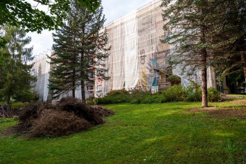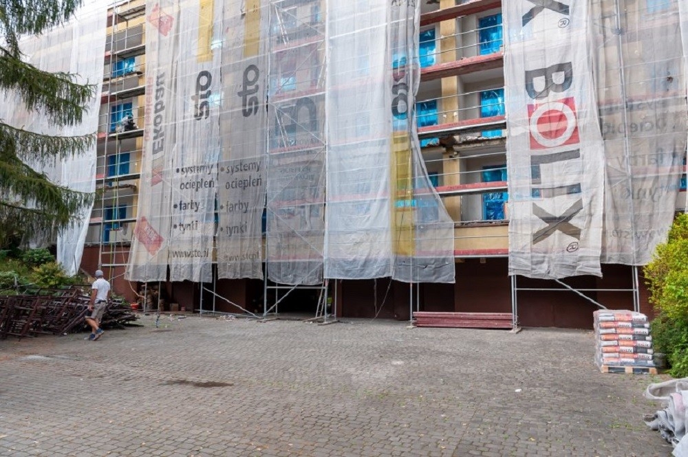 W ramach projektu modernizowana jest też elewacja budynku wraz zadaszeniem loggi. Budynek zostanie częściowo ocieplony, uzupełnione zostaną ubytki w tynku, a budynek zyska nowy kolor. Zakończenie prac zaplanowano latem przyszłego roku.