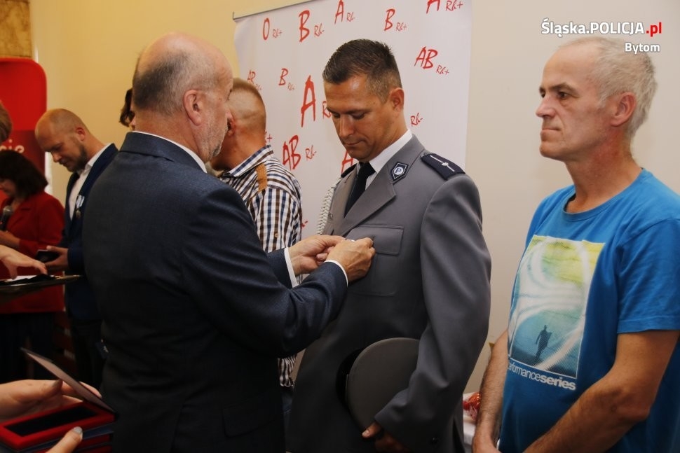 Młodszy aspirant Marcin Ciemka jest dzielnicowym komisariatu II przy ulicy Chrzanowskiego. Od 15 lat jest honorowym dawcą krwi. W tym czasie nasz policjant oddał ponad 27 litrów drogocennego płynu. Za swoją działalność został uhonorowany najwyższym odznaczeniem Honorowego Dawcy Krwi Zasłużonego Dla Zdrowia Narodu. Uroczysta ceremonia odbyła się w minioną środę w Hotelu Katowice. Medal, który otrzymał bytomski stróż prawa, jest odznaczeniem państwowym nadanym mu przez Ministra Zdrowia. Serdecznie gratulujemy!!!