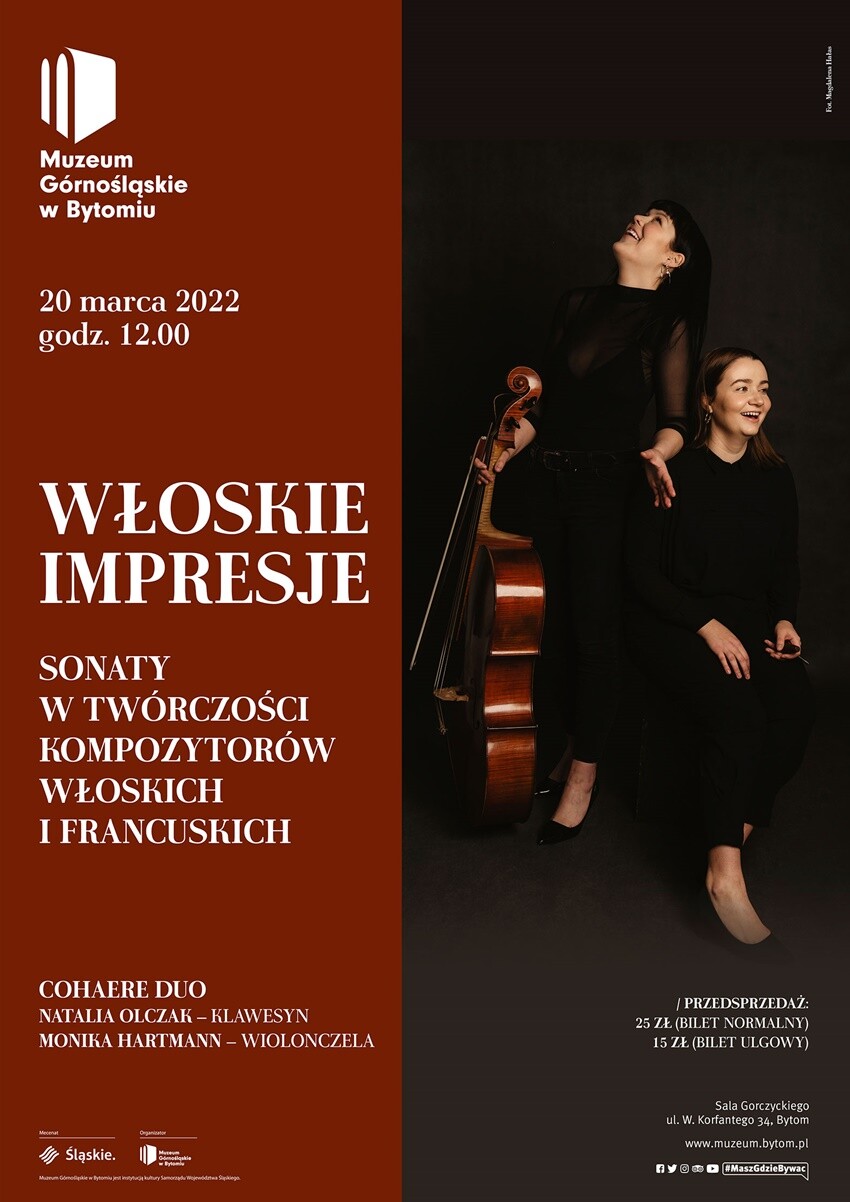 Z okazji Dnia Muzyki Dawnej, obchodzonego w tym roku po raz dziesiąty, Muzeum Górnośląskie w Bytomiu zaprasza na niezwykły koncert. 20 marca o godz. 12.00 w Sali G.G. Gorczyckiego, dwie utalentowane artystki młodego pokolenia – Monika Hartman i Natalia Olczak - wykonają dla Państwa przepełnione emocjami sonaty włoskich i francuskich kompozytorów. Usłyszymy m.in. sonaty na wiolonczelę i basso continuo takich kompozytorów jak Antonio Vivaldi, Michel Corrette i Giovanni Platti.
