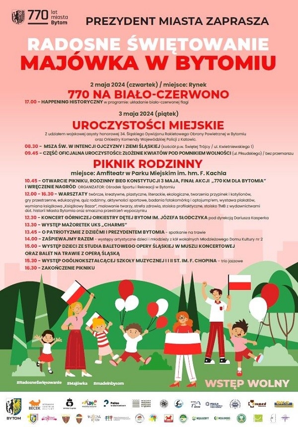 Święto Konstytucji 3 Maja podobnie jak przed rokiem uświetnimy rodzinnym piknikiem w Parku im. hm. Franciszka Kachla. Zanim jednak rozpoczniemy piknik, od godz. 8:30 odbędą się miejskie uroczystości z udziałem wojskowej asysty honorowej 34. Śląskiego Dywizjonu Rakietowego Obrony Powietrznej w Bytomiu oraz Orkiestry Komendy Wojewódzkiej Policji w Katowicach. Oficjalne obchody rozpoczną się od mszy świętej w intencji Ojczyzny i ziemi śląskiej w kościele pw. Świętej Trójcy przy ul. Kwietniewskiego 1, po której pod Pomnikiem Wolności około 9:45 delegacje złożą kwiaty.