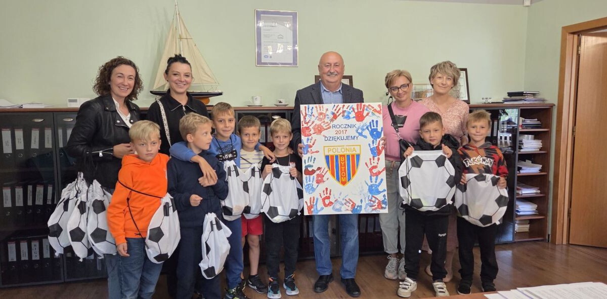 Młodzi piłkarze z rocznika 2017 grający na co dzień w Akademii Piłkarskiej Polonii Bytom odwiedzili firmę Lechbud, aby podziękować prezesowi Leszkowi Dziubowi za wsparcie, jakiego udzielił drużynie. Młodzi piłkarze, a zarazem uczniowie II klasy Szkoły Podstawowej Mistrzostwa Sportowego im. ks. Józefa Szafranka w Bytomiu wręczyli prezesowi Lechbudu własnoręcznie namalowany herb Polonii Bytom, ozdobiony odciskami dłoni młodych sportowców.