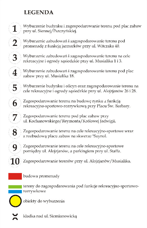 Urządzenia dla dzieci staną też w miejscach po wyburzonych uprzednio zabudowań gospodarczych przy ul. Musialika 1, 3 i 18. Dodatkowo przy ul. Musialika 1 i 3 powstaną ogródki, gdzie będzie można uprawiać rośliny. Podobnie będzie z pustymi miejscami po wyburzonym budynku przy ul. Alojzjanów 28 i prawej oficynie przy Alojzjanów 26.