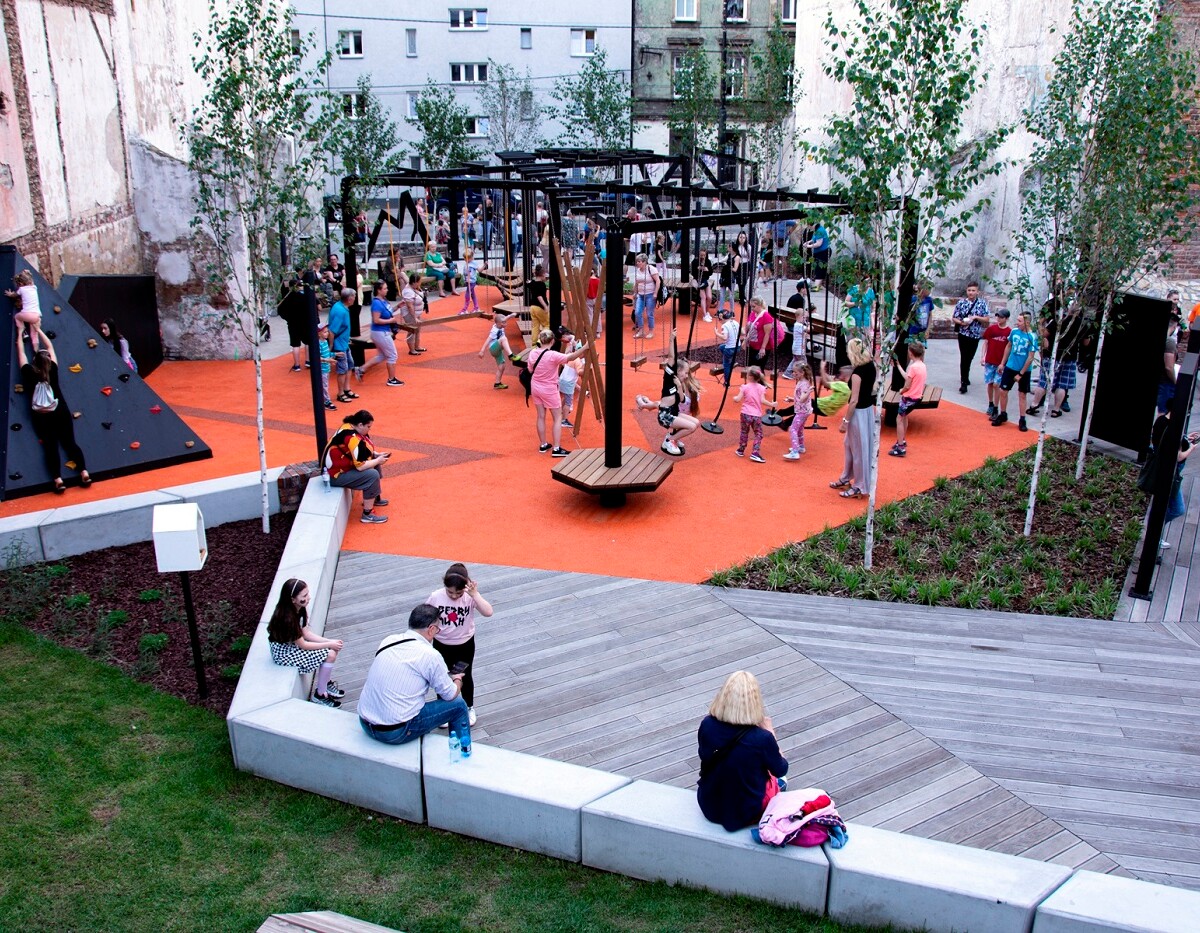 Zaprojektowany przez krakowską pracownię projektzieleni.pl - architektki krajobrazu: Annę Becker, Marlenę Pilch, Magdalenę Wnęk - park kieszonkowy, pełni podwójną rolę: placu zabaw dla dzieci oraz miejsca relaksu i wypoczynku.