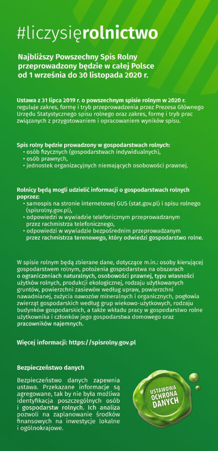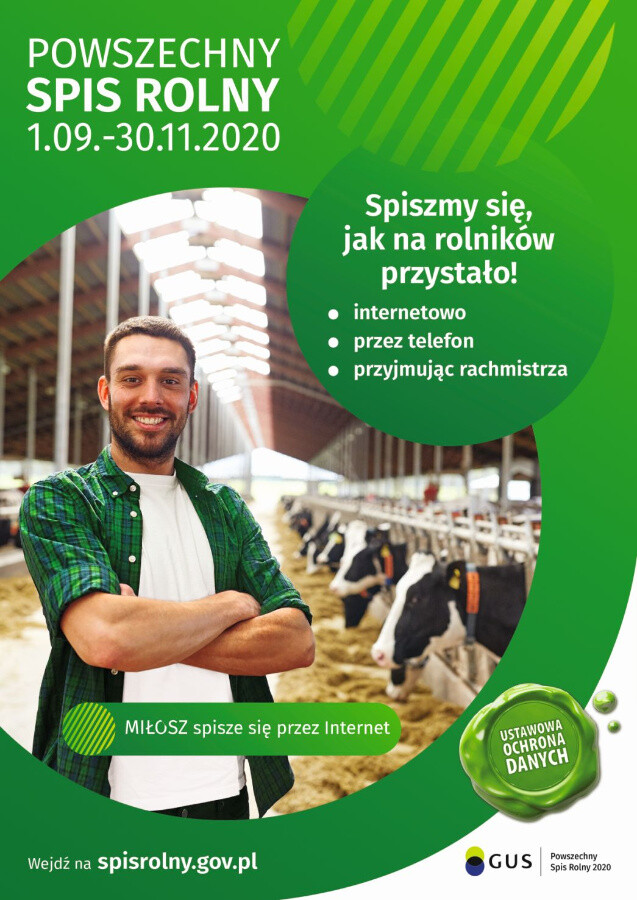 Odbywający się raz na 10 lat Powszechny Spis Rolny przeprowadzony będzie w całej Polsce od 1 września do 30 listopada 2020 roku. Spis prowadzony będzie internetowo, telefonicznie oraz osobiście przez rachmistrzów spisowych.
