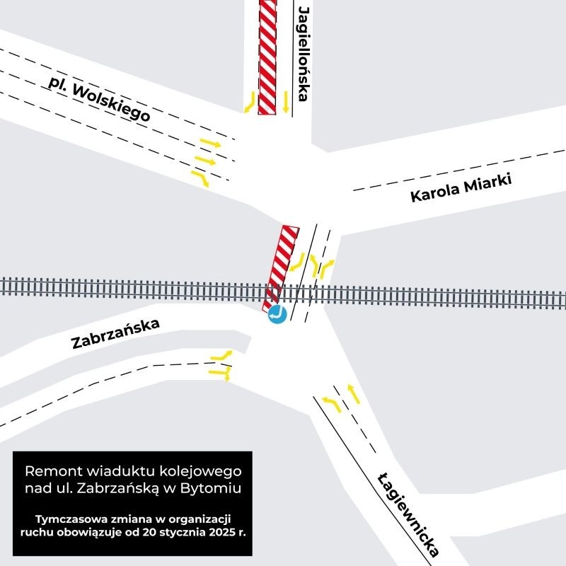 Zmiany będą polegały na zwężeniu jezdni pod wiaduktem i wprowadzeniu zakazu poruszania się skrajnym, prawym pasem ruchu od placu Wolskiego w kierunku ul. Zabrzańskiej. W stronę Szombierek kierowcy pojadą wewnętrznym pasem ruchu - po torowisku.