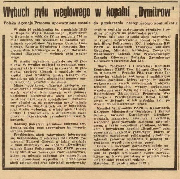 - Mimo wyjątkowej ofiarności zastępów ratowniczych i wykorzystania najnowocześniejszych środków technicznych oraz pomocy udzielonej kierownictwu akcji ratowniczej ze strony najlepszych specjalistów i naukowców górnictwa, na posterunku zginęło 33 górników znajdujących się w bezpośredniej strefie wybuchu, a wśród nich 17 osób dozoru i pracowników o długoletnim stażu pracy i najwyższych zawodowych kwalifikacjach - głosił komunikat przekazany do prasy, który można było przeczytać również w Życiu Bytomskim.