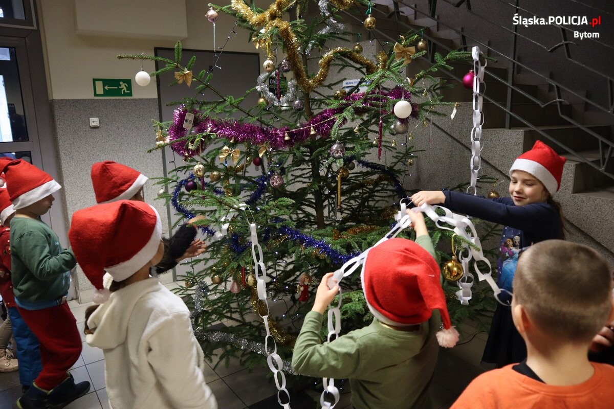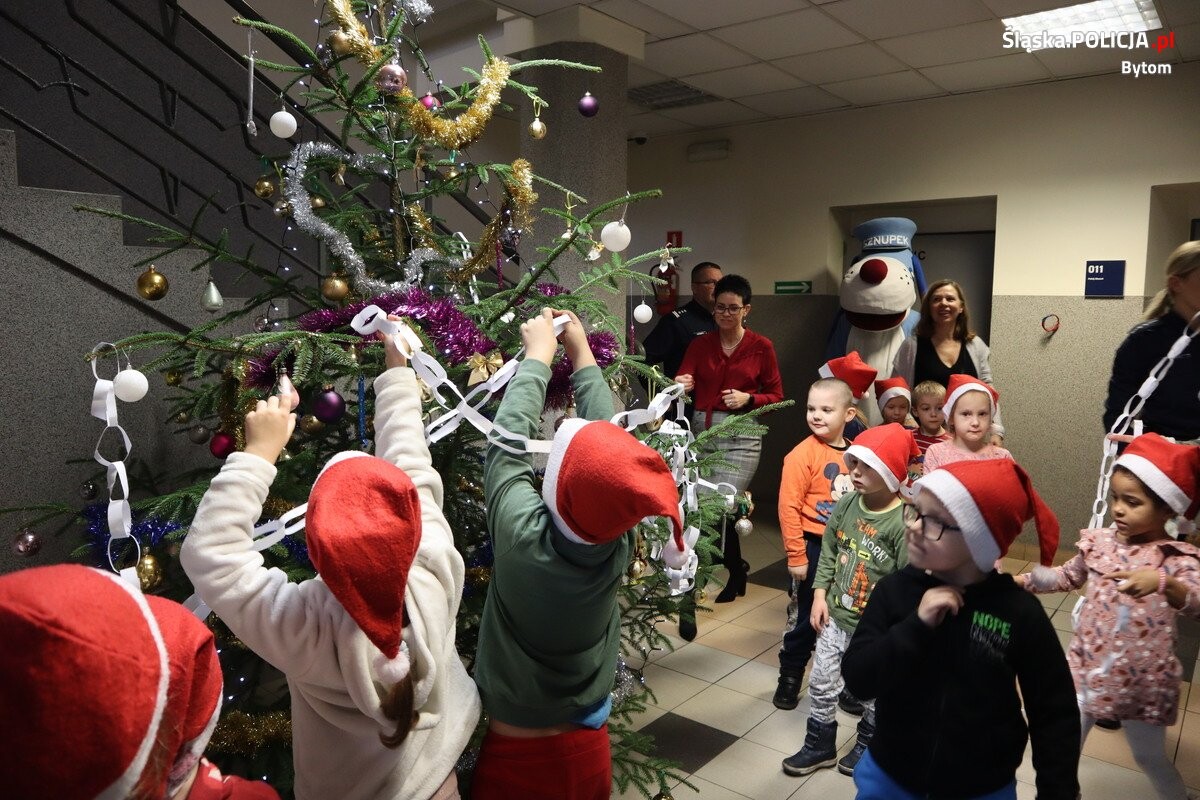 Dzisiaj, na zaproszenie Komendanta Miejskiego Policji w Bytomiu inspektora Andrzeja Brzozowskiego, w komendzie gościły dzieci z przedszkola przy ulicy Czarnieckiego. Przedszkolaki, wspólnie z Komendantem i jego zastępcą, ozdobiły "policyjną choinkę" i przypomniały sobie zasady bezpiecznego zachowania. Niespodzianką dla najmłodszych okazał się pies "Sznupek" - maskotka śląskiej Policji.
