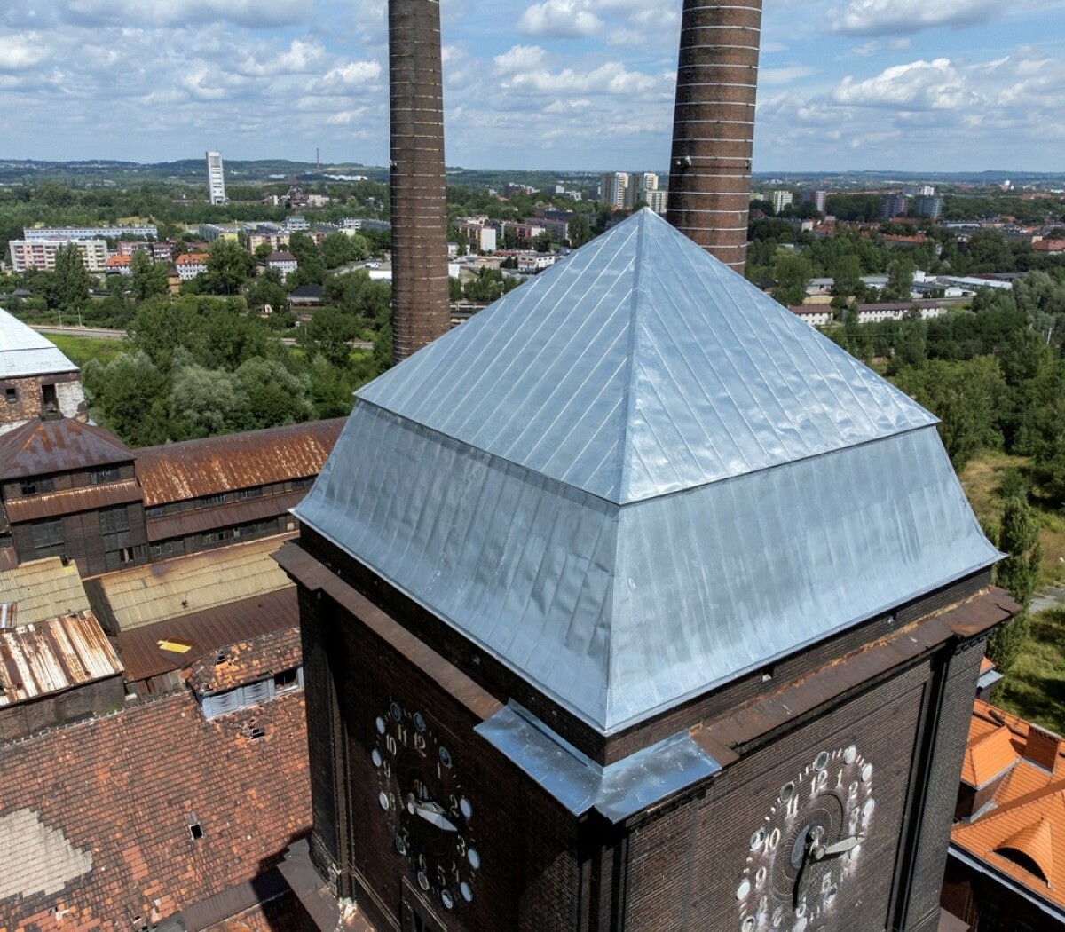 Wieża wodno-zegarowa Elektrociepłowni Szombierki ma nowy dach. Grupa ARCHE, która od 2022 roku jest właścicielem postindustrialnego zabytku, zakończyła prace remontowe zniszczonej konstrukcji i pokrycia dachu. Trwające od maja prace obejmowały wymianę konstrukcji więźby dachowej, elementów schodów i podłogi. Dach został pokryty blachą tytanowo-cynkową oraz zamontowane zostały brakujące rynny.